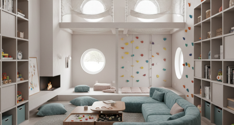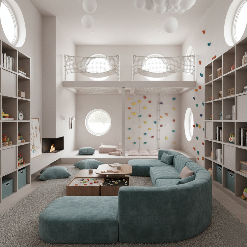 · The “Adjacent Play” Principle: Instead of a fully open plan, consider defined zones separated by wide arches, partial-height walls, or sliding panels (like large barn doors or Japanese-style screens). This allows a child to play in a “contained” area within sight of a parent working in the kitchen, without toys invading the entire living space. Acoustic considerations can be integrated.